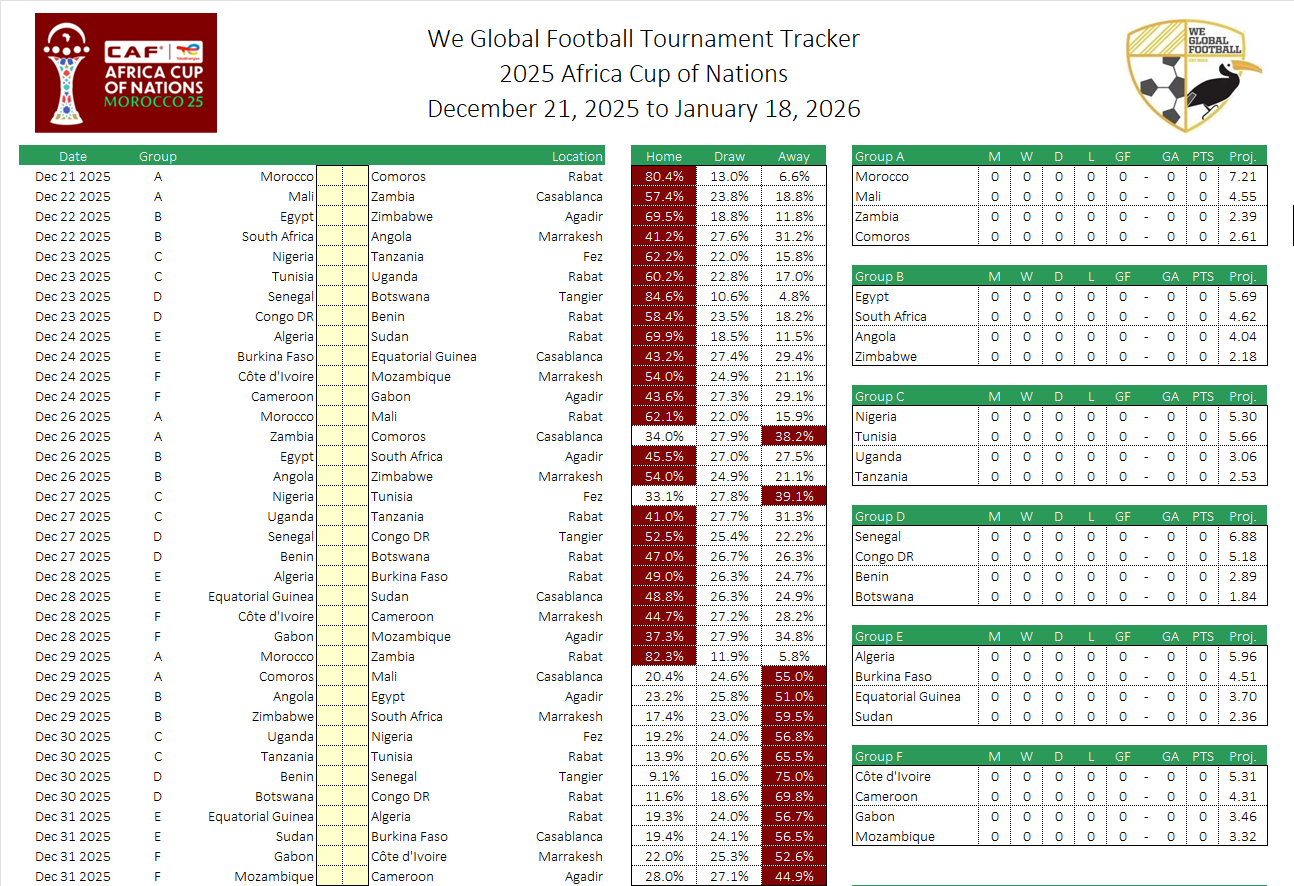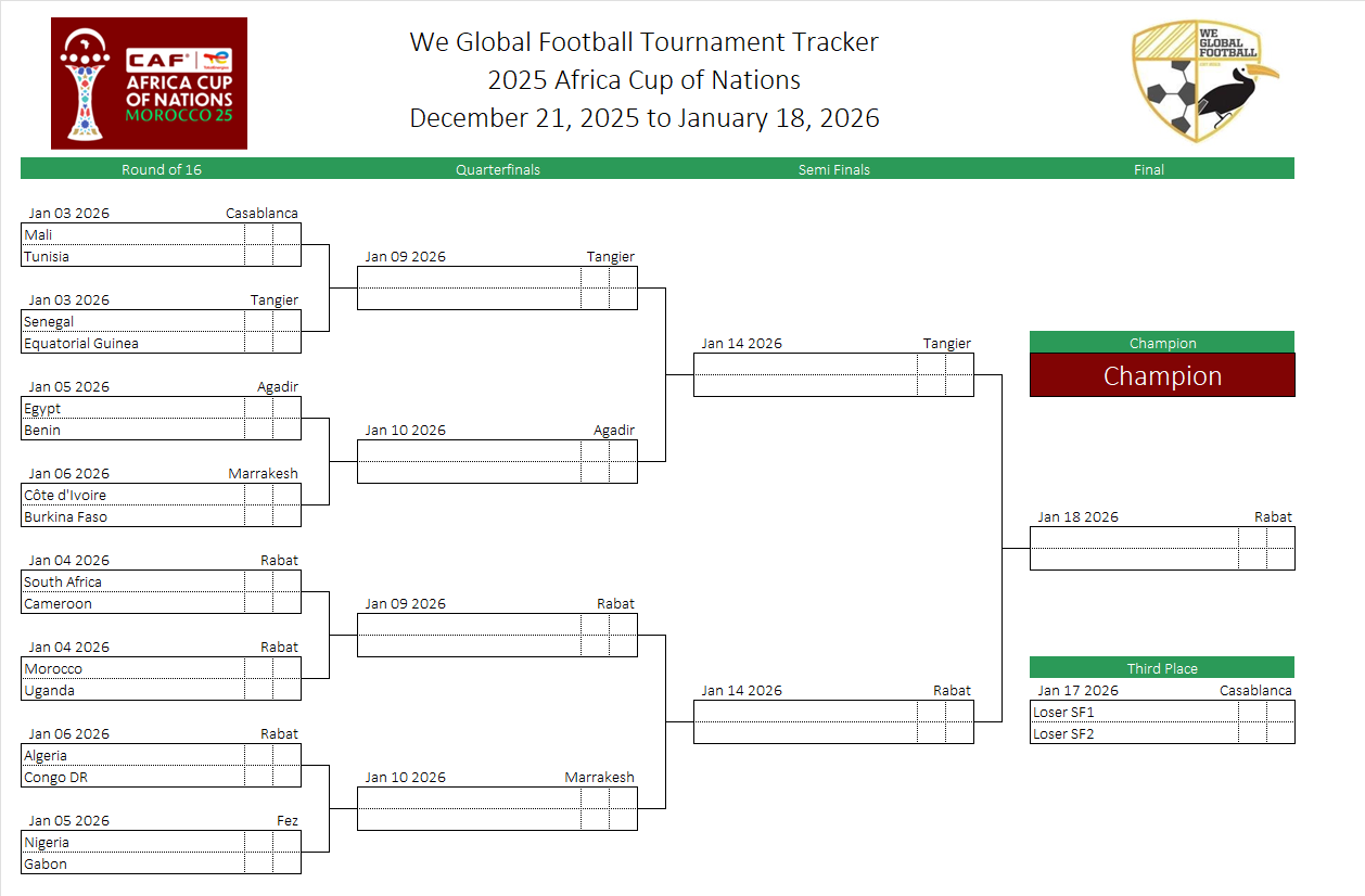 Tournament tracker for the 2025 Africa Cup of Nations (AFCON). The tournament will take place between December 2025 and January 2026. Track and enter scores for each match and follow the tournament.